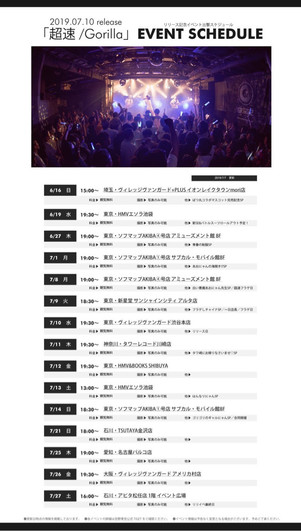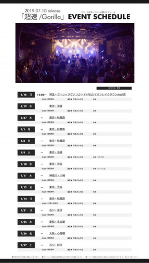 7月にリリースされる両A面シングル「超速 / Gorilla」のリリイベ日程が、速報ベースにて発表となりました。詳細は追って補完されます。