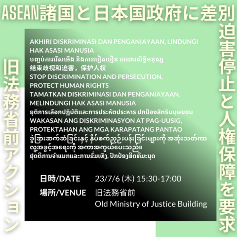 7/6の【#改悪入管法を廃止へ #入管法改悪反対アクション 】 「ASEAN諸国と日本国政府に差別迫害停止と人権保障を要求する」法務省前アクション