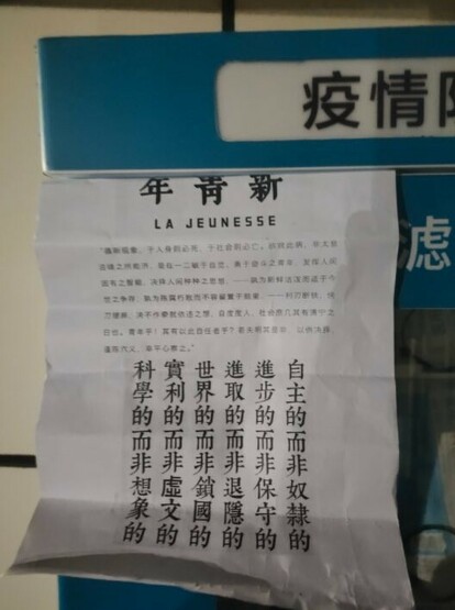 A late 2022 postscript: an image of the " A Letter to Young People" printed in the first issue of La Jeunesse, 1915 (see top of thread) at Zhejiang University; and quotes from Lu Xun's "A Madman's Diary" and "Preface," spotted taped to benches on Beijing Languages Academy campus this evening.