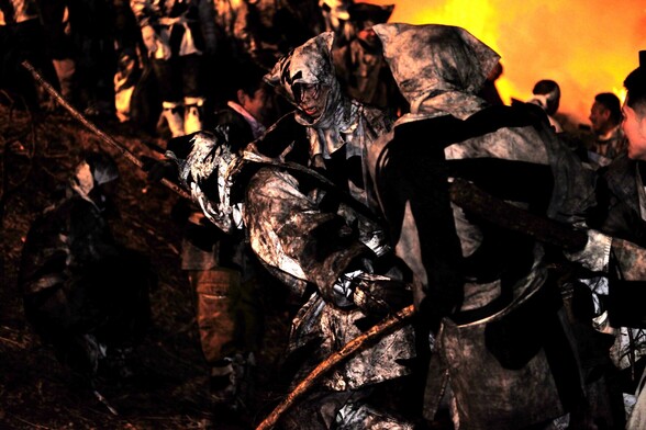 クライマックスの「火祭り」では、白装束の男衆が、祖父、祖母、孫の鬼面をかぶった3人を追い回します。