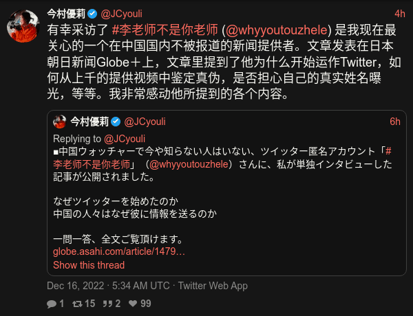 有幸采访了 #李老师不是你老师 (@whyyoutouzhele@twitter.com) 是我现在最关心的一个在中国国内不被报道的新闻提供者。文章发表在日本朝日新闻Globe+上,文章里提到了他为什么开始运作Twitter,如何从上千的提供视频中鉴定真伪,是否担心自己的真实姓名曝光,等等。我非常感动他所提到的各个内容。 https://twitter.com/JCyouli/status/1603592068068438017