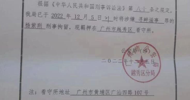 据中国维权网消息,广州女青年 #杨紫荆 因11月27日晚陪朋友到广州海珠广场围观抗议清零政策的行动,近日遭越秀区警方以“寻衅滋事”罪刑事拘留。维权网认为,这是属于 #秋后算帐 的案例。 https://www.rfa.org/mandarin/Xinwen/1-12102022102015.html#.Y5UNb3SqYRo.twitter https://nitter.hongkongers.net/RFA_Chinese/status/1601721673916583944#m