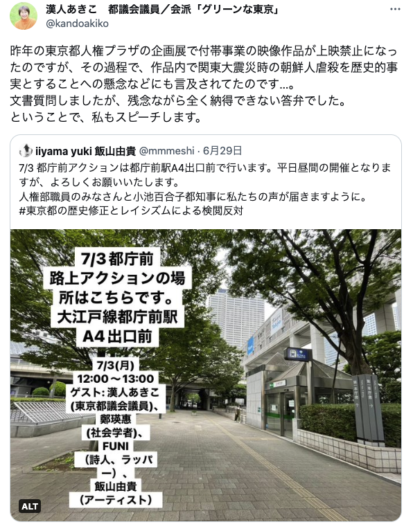 "昨年の東京都人権プラザの企画展で付帯事業の映像作品が上映禁止になったのですが、その過程で、作品内で関東大震災時の朝鮮人虐殺を歴史的事実とすることへの懸念などにも言及されてたのです…。