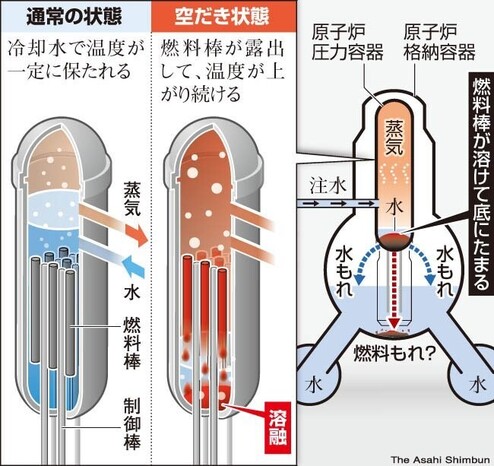 福島第一原発2号機で燃料の大部分が圧力容器内の底に溶け落ちる。