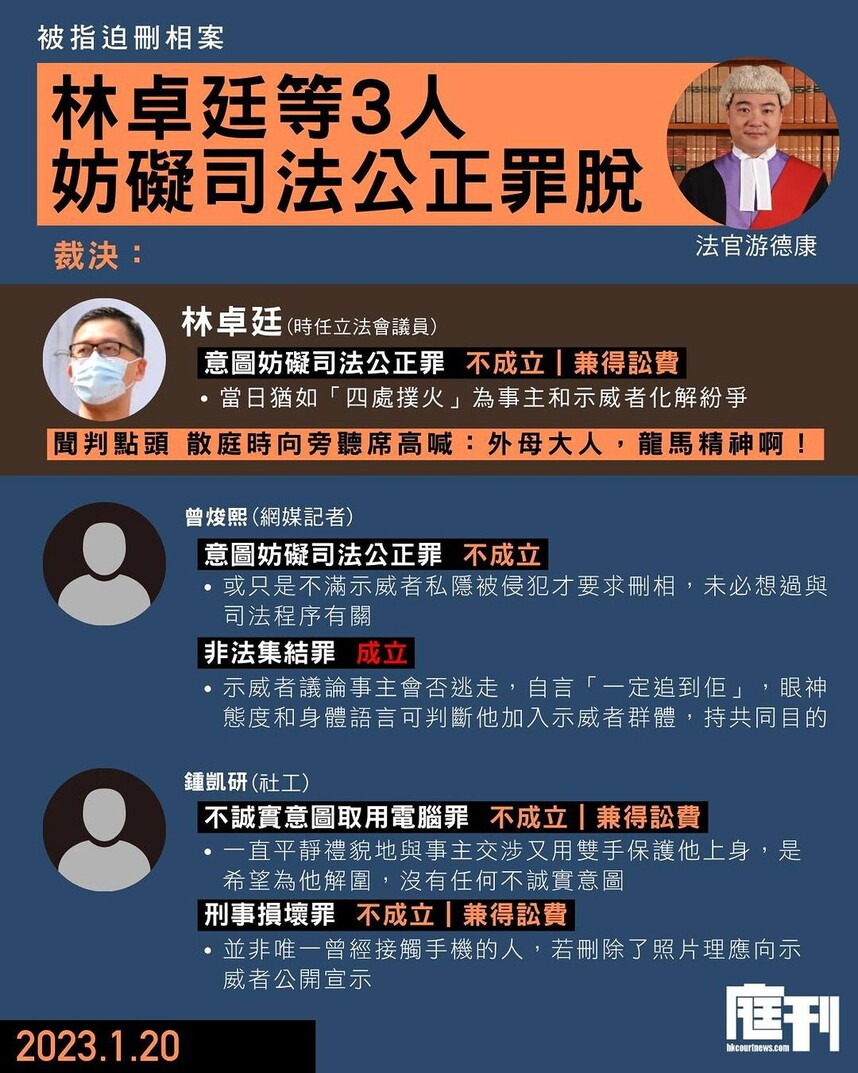 2019年7月「#光復屯門公園」遊行,一名男子X先被質疑在現場拍攝示威者,繼而被懷疑曾拍攝7.1警總外示威者的大頭照,因而被示威人士包圍指罵。民主黨時任立法會議員 #林卓廷 及 #許智峯 等共4人,涉嫌要求該人刪除相關照片,被控 #意圖妨礙司法公正、#不誠實意圖取用電腦 等罪。許智峯現時已離開香港,其餘3人就否認控罪受審,案件今(20日)在西九龍裁判法院裁決。法官游德康直言,林卓廷當日猶如「四處撲火的人」,為事主和示威者化解紛爭,其間態度平和、舉止冷靜,化身為雙方隔熱點,「實在感受不到他是要脅迫事主,妨礙將來可能會發生的刑事檢控」,裁定林罪名不成立;而被指不誠實意圖取用電腦及刑毀照片的社工鍾凱研,亦被裁定全數罪名不成立;至於案發時為網媒記者的曾焌熙,雖然意圖妨礙司法公正亦罪脫,但被裁定非法集結罪成,須還押至2月9日判刑。