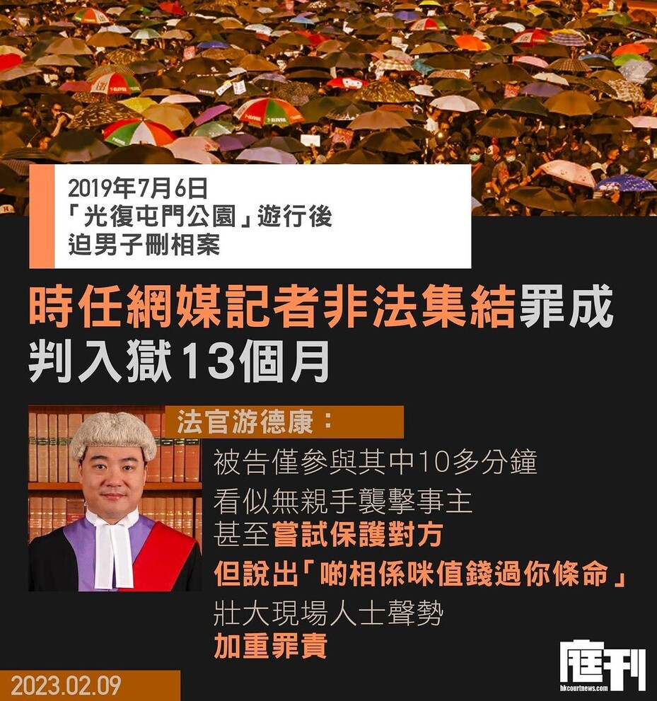 2019年7月「#光復屯門公園」遊行後,一名男子被質疑在現場拍攝示威者,及曾拍攝7.1警總外示威者的大頭照,遭示威人士包圍指罵,民主黨時任立法會議員 #林卓廷 及 #許智峯 等共4人,被指要求對方刪去照片,除已離港的許智峯,其餘3人否認意圖妨礙司法公正等罪受審,當中林卓廷及一名社工被裁定罪成不成立,另一時任網媒記者曾焌熙則非法集結罪成,今(9日)在區域法院被判刑。法官游德康指,人群在光天化日、警署圍牆咫尺之外包圍及襲擊事主,明言案情嚴重,被告雖看似沒有親手襲擊事主,甚至嘗試保護對方,但他說出「啲相係咪值錢過你條命」等話,是壯大人群聲勢,加重罪責,判被告入獄13個月。