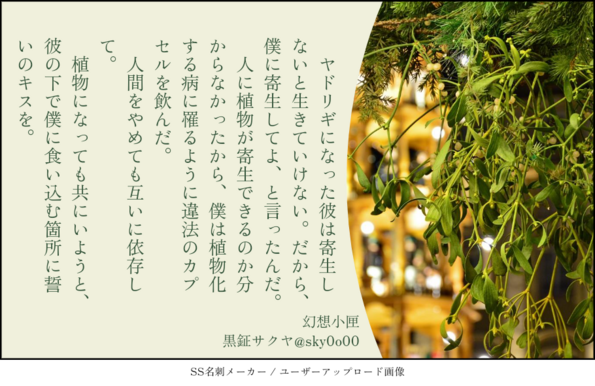 突然、人間が植物化してしまう病が蔓延る世界で、ヤドリギに変わる恋人と一体化したいと策を講じる、依存性の高い狂気系青年の話。