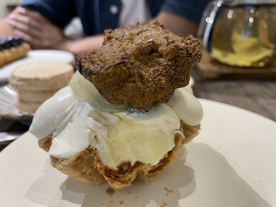 正在我「移駕」一半可麗路的過程中,一個手眼不怎麼協調,可麗路就「啪」直接砸在吃了一半、軟軟檸檬千層的內餡上。