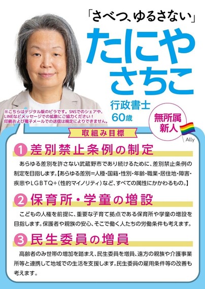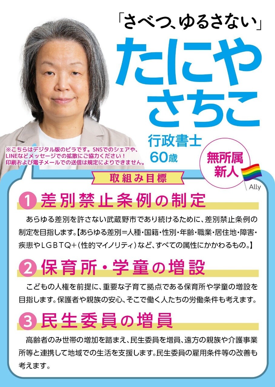 #統一地方選挙2023 #武蔵野市議会議員選挙 #武蔵野市議選 #武蔵野市 #たにやさちこ #さべつゆるさない