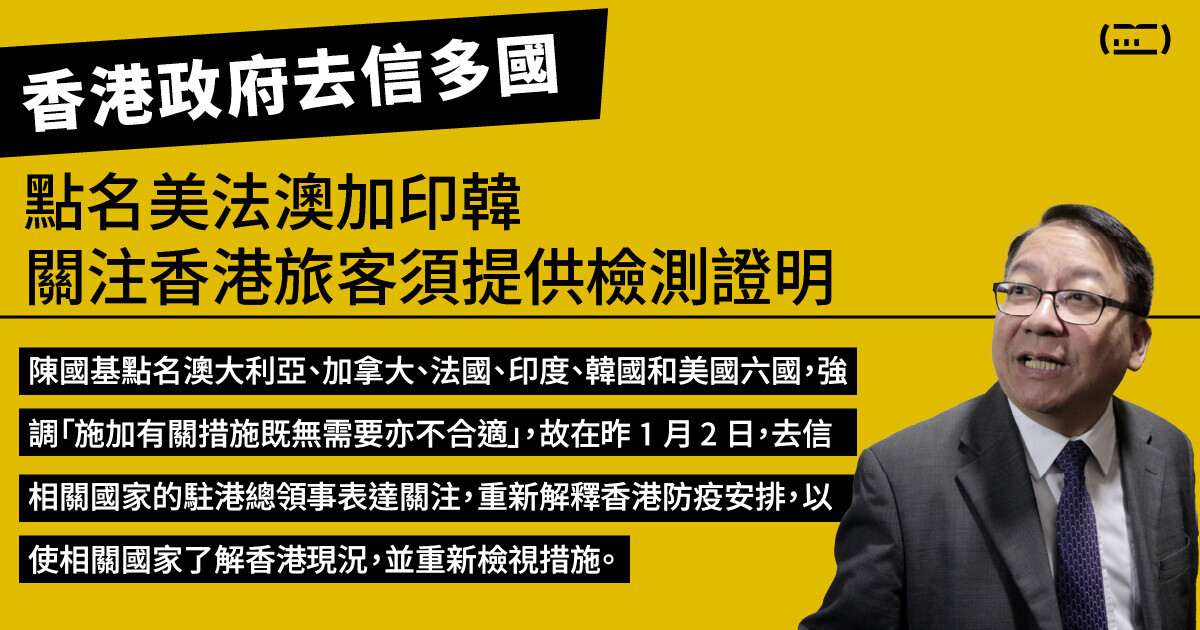 香港政府去信多國 點名美法澳加印韓 關注香港旅客須提供檢測證明