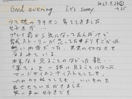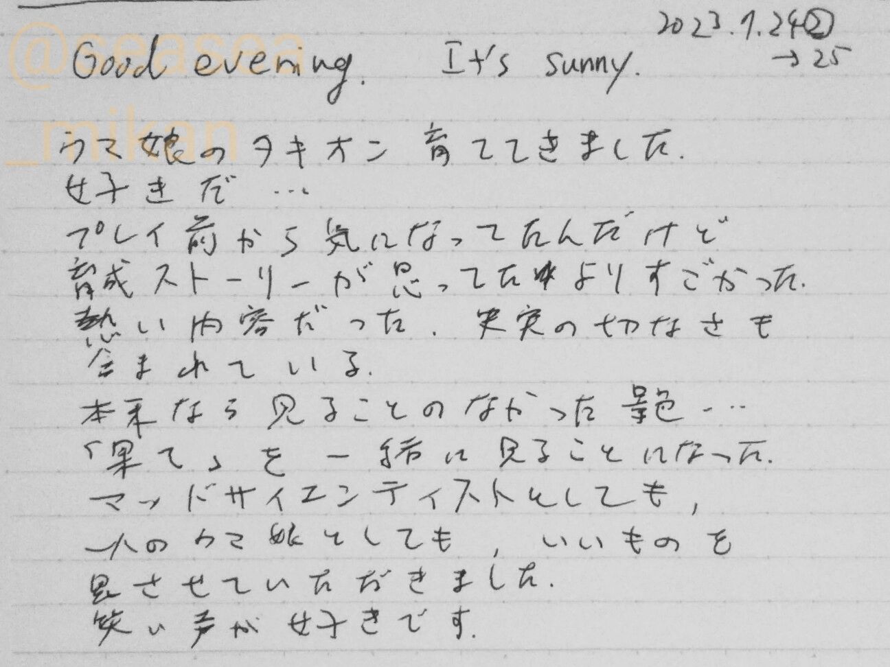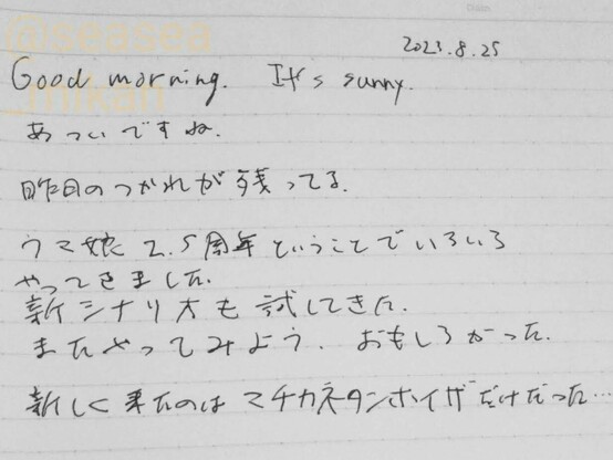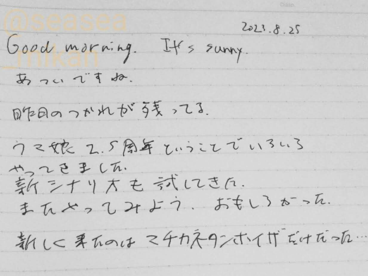 #海の手書き日記 #ウマ娘 昨晩書きそびれた分です。新シナリオやってきたよウマ娘ガチャ何回か回したけど新しく来たの一人だけだったな…まあいいか、才能開花進んだし…あとのジュエルはサポカに使おう