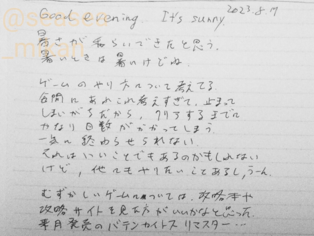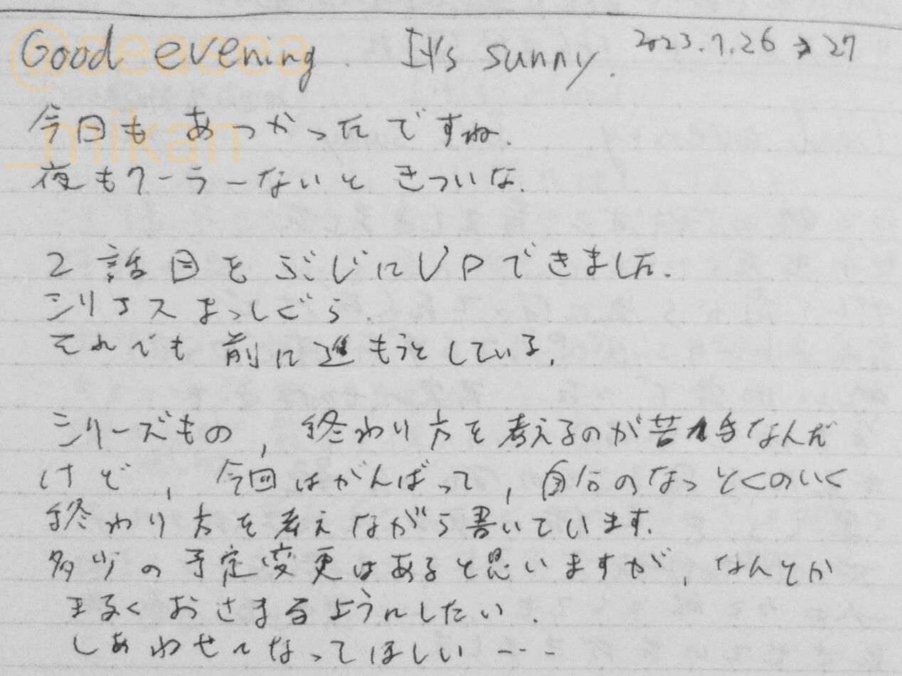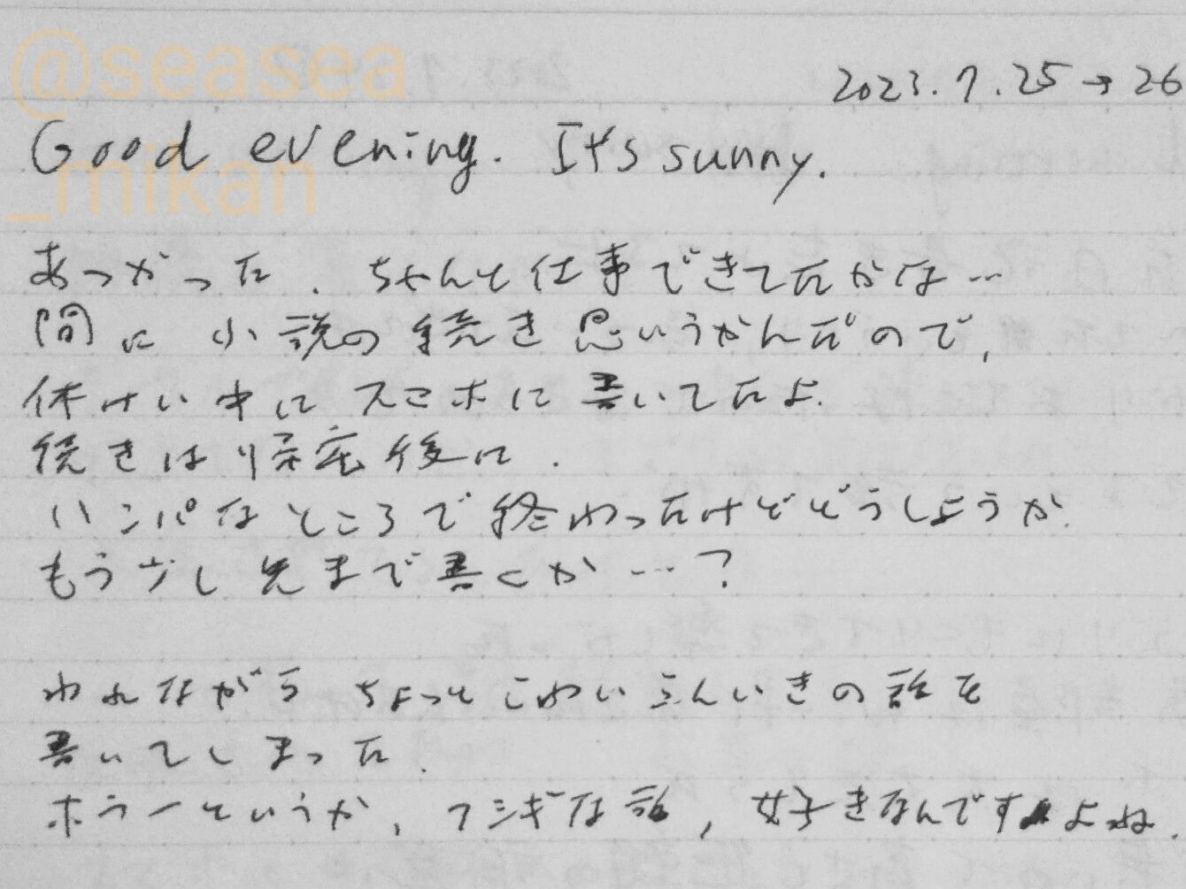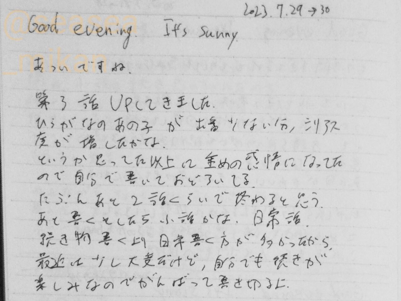 #海の手書き日記 短めの話を書くことが多いから続き者はあまり自信がなかったけど、最近はなんやかんやでやってきてますね終わりに向かってがんばります