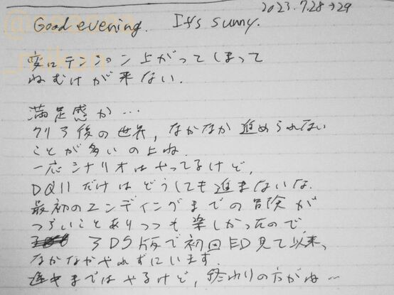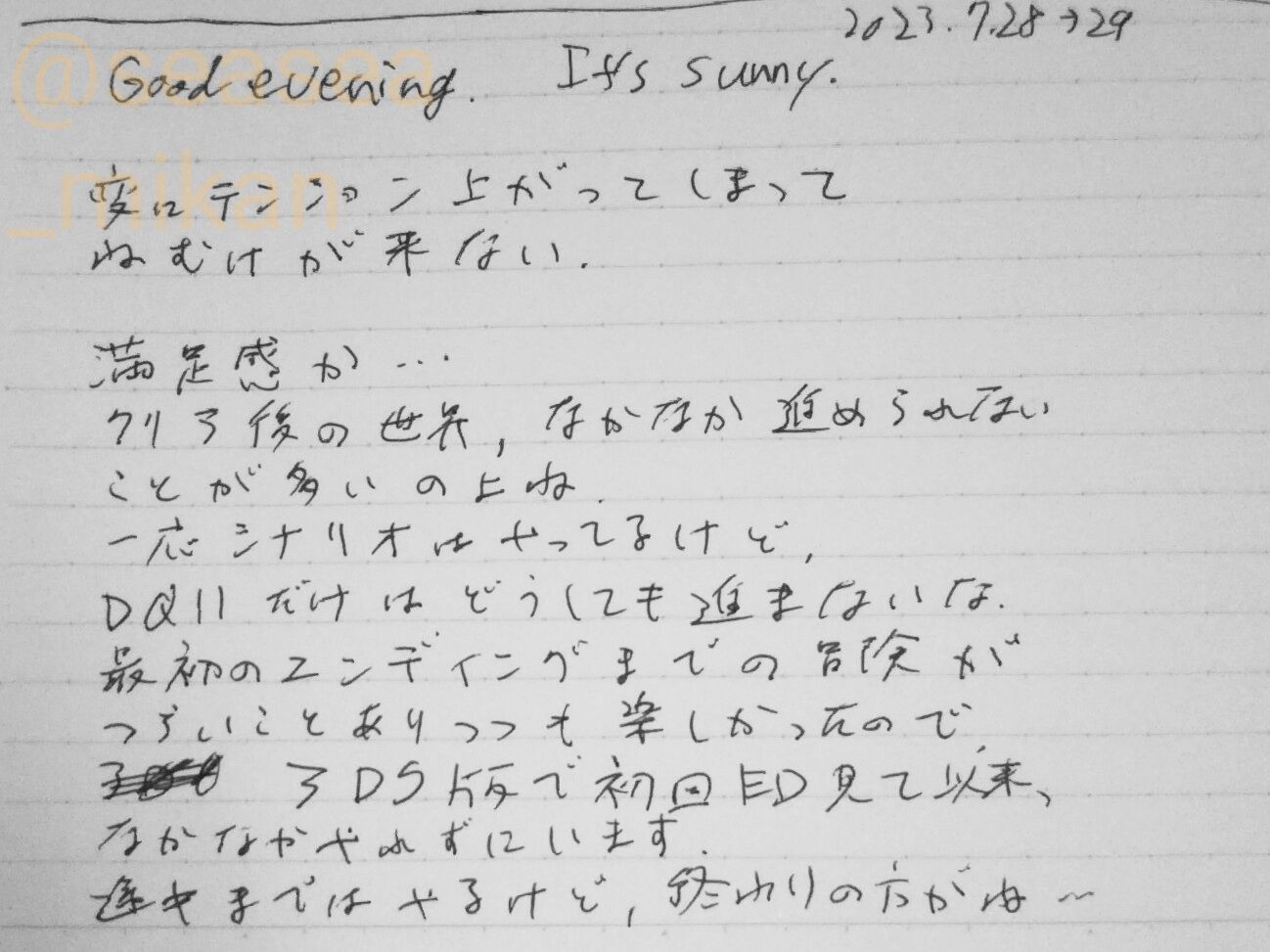 #海の手書き日記 #DQ11クリア後どうするかって難しいよなと思ったもともとそこまでやり込むタイプじゃないしな…未だに自分ではエンディング1回しか見てないDQ11…面白いし色々試したくなるから何度もやり直すんだけどね…