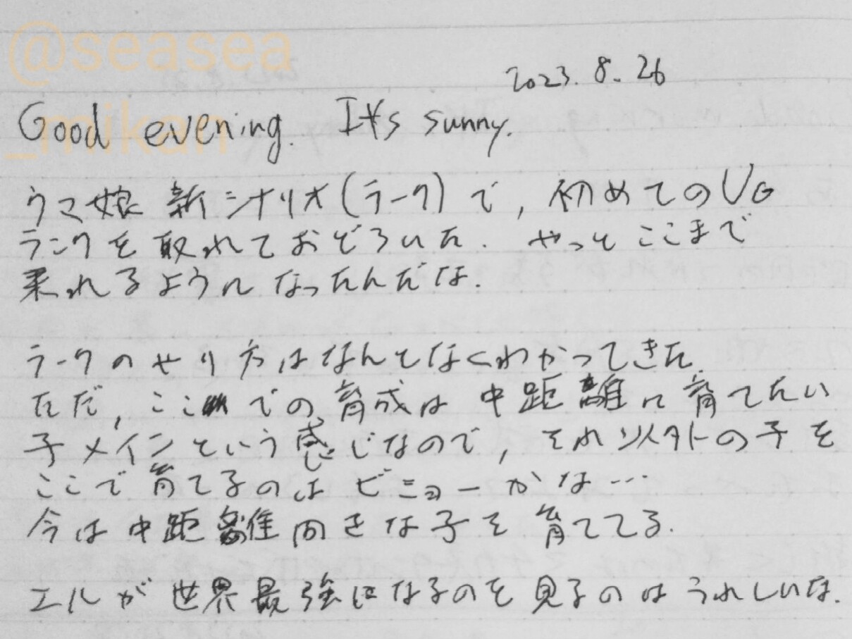 #海の手書き日記 #ウマ娘 これまで頑張ってもSSまでだったのが、初めてUGランク取れたので驚いたよくがんばったよエルちゃん