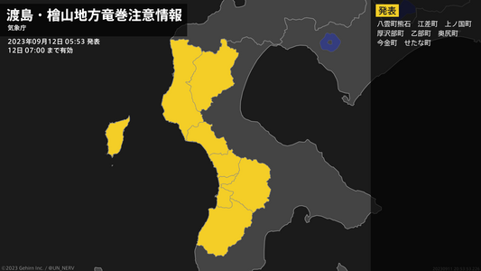 【渡島・檜山地方 竜巻注意情報】渡島・檜山地方は、竜巻などの激しい突風が発生しやすい気象状況になっています。頑丈な建物内に移動するなど安全確保に努めてください。この情報は12日07:00まで有効です。#竜巻注意情報 #渡島・檜山地方