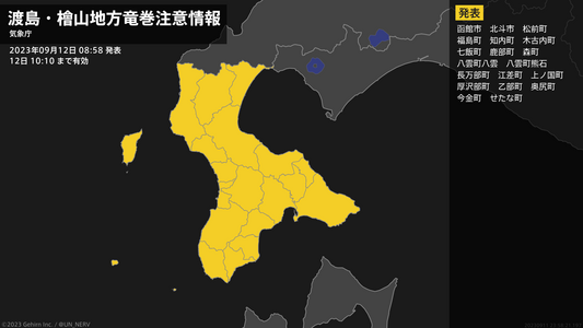 【渡島・檜山地方 気象情報 2023年09月12日 16:31】12日夜遅くにかけて、檜山地方では土砂災害に、渡島・檜山地方では竜巻などの激しい突風や落雷、ひょう、急な強い雨に注意してください。#気象情報 #渡島・檜山地方