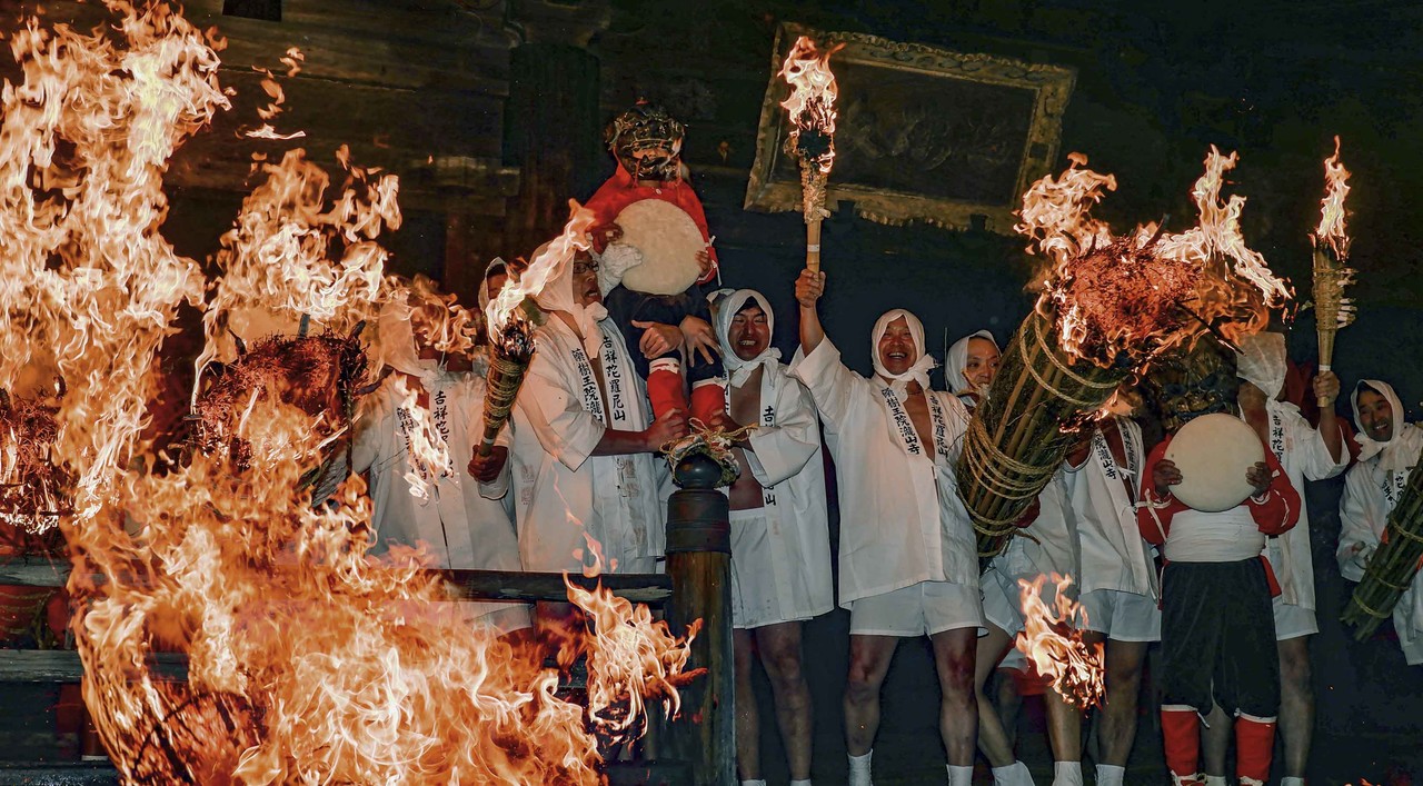 クライマックスの「火祭り」では、白装束の男衆が、祖父、祖母、孫の鬼面をかぶった3人を追い回します。