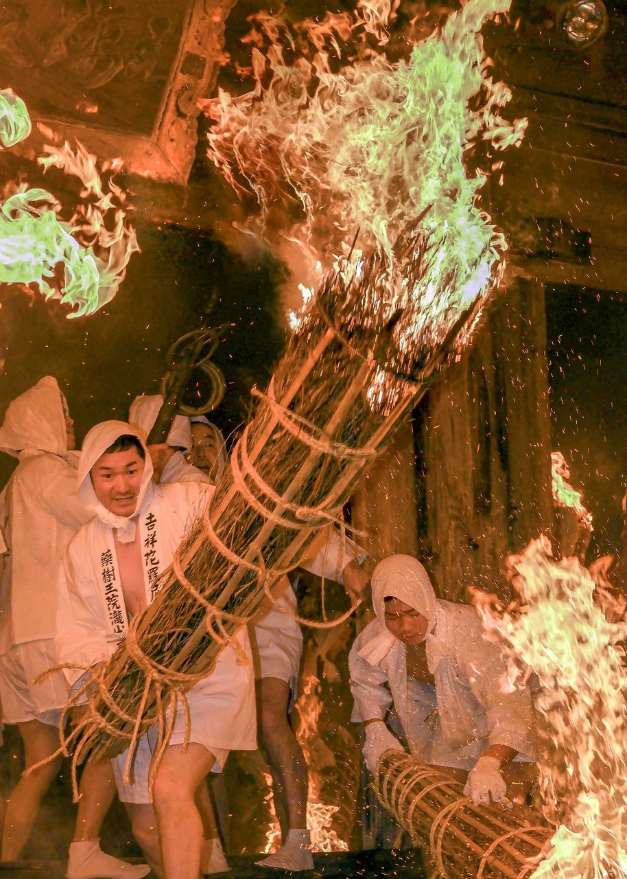 愛知県岡崎市の #滝山寺 で11日、奇祭として知られる「#滝山寺鬼まつり」がありました。呼び物の「火まつり」では、燃え盛るたいまつを振る白装束の男衆と #鬼 が本堂の回廊を巡り、闇夜に炎が舞う荘厳な世界が広がりました。