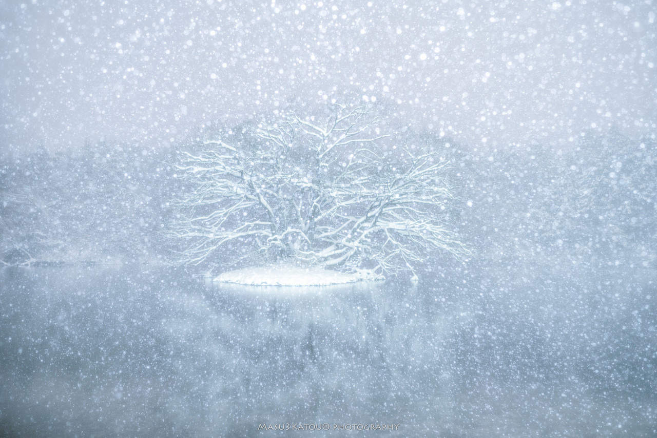 暗闇の中 降りしきる雪に耐える湖面の樹木を撮ってみた