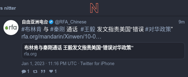#布林肯 與 #秦剛 通話 #王毅 發文指責美國“錯誤 #對華政策” https://www.rfa.org/mandarin/Xinwen/10-01012023171006.html#.Y7IUQPwbOEg.twitter https://nitter.hongkongers.net/RFA_Chinese/status/1609690091697639425#m