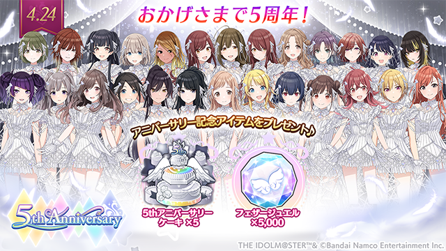 5th Anniversary当日の記念として、本日ゲーム内にログインしていただくと『5thアニバーサリーケーキ×5』と『フェザージュエル 5,000個』をプレゼント中です〜。
