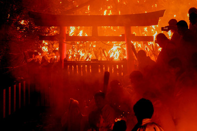 写真は聖域 神倉山 神倉神社のゴトビキ岩にある鳥居 炎に包まれる聖域、お灯祭りの風景を新たな方法で再現像、表現してみました。