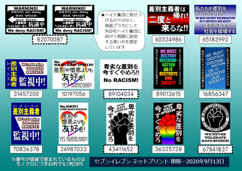 ヘイトデモやヘイト街宣へのカウンター用のプラカードを7-11ネットプリントに登録しました。12月5日まで有効です。