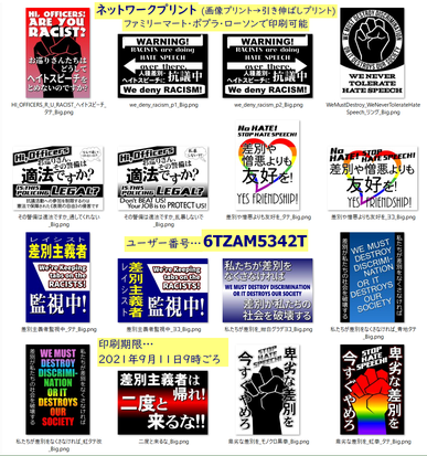 ヘイトデモやヘイト街宣へのカウンター用プラカードをネットワークプリントに登録しました(ユーザー番号 6TZAM5342T 画像プリント→引き伸ばしプリント)。ファミリーマート・ポプラ・ローソンで9月11日の朝9時ごろまで印刷できますので、それまで突発的に必要になった場合にもご利用いただけます。
