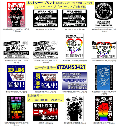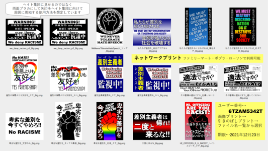 ヘイトデモや街宣へのカウンター用プラカードをネットワークプリントに登録しました(ファミリーマート・ポプラ・ローソンで印刷可能。ユーザー番号 6TZAM5342T 画像プリント→引き伸ばしプリント)。11月24日2時まで印刷可能で、それまで必要になった場合にご利用いただけます。