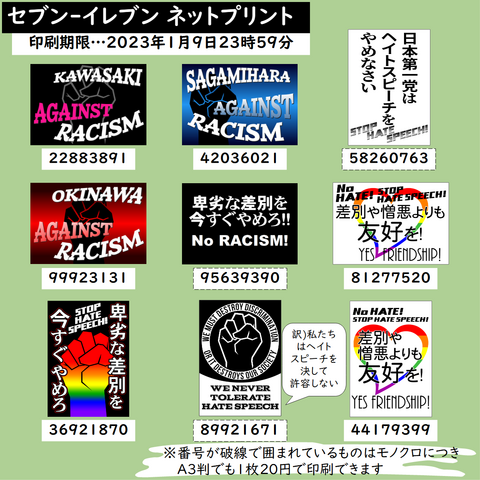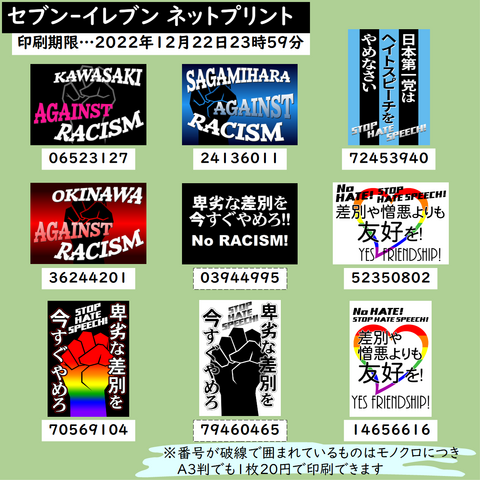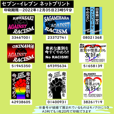ヘイトデモやヘイト街宣へのカウンター用のプラカードを7-11ネットプリントに登録しました(画像1~2枚目)。12月22日まで有効です。