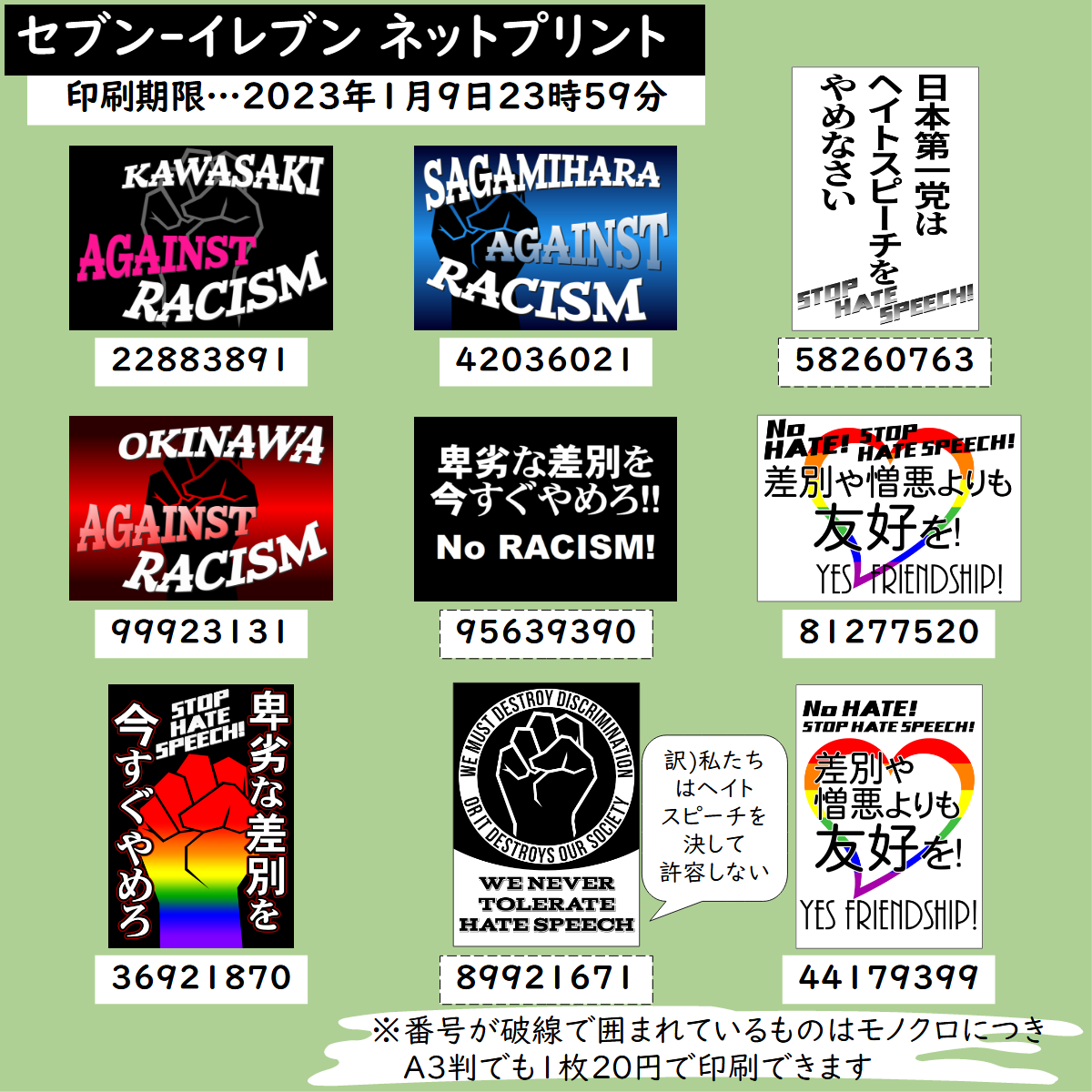 ヘイトデモ・ヘイト街宣へのカウンターや反差別を訴えるスタンディング等にお使いいただくためのプラカードをセブン-イレブンのネットプリントに登録しました。印刷期限は2023年1月9日ですので、それまで突発的に必要になったときに印刷してご利用いただけます。
