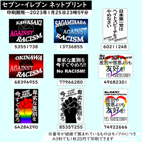 ヘイトデモ・ヘイト街宣へのカウンターや反差別を訴えるスタンディング等にお使いいただくためのプラカードをセブン-イレブンのネットプリントに登録しました。印刷期限は2023年1月17日ですので、それまで突発的に必要になったときに印刷してご利用いただけます。