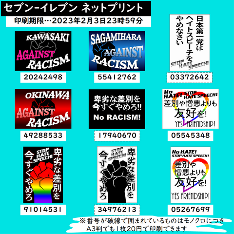 ヘイトデモ・ヘイト街宣へのカウンターや反差別を訴えるスタンディング等にお使いいただくためのプラカードをセブン-イレブンのネットプリントに登録しました。印刷期限は2023年2月3日ですので、それまで突発的に必要になったときに印刷してご利用いただけます。
