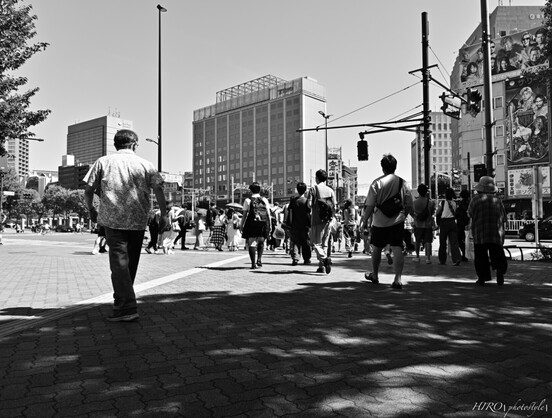 信号が変わると、覚悟を決めたように太陽が照りつける横断歩道へと向かう人達🚶