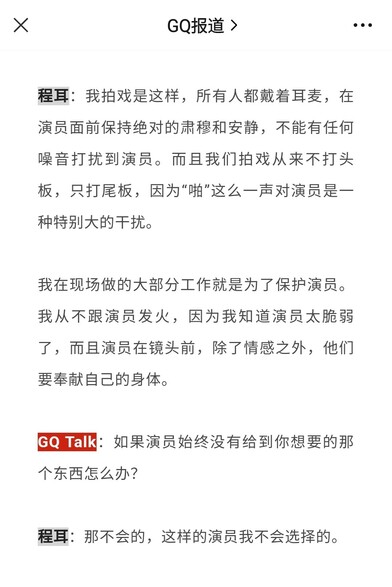 朋友说程耳电影高傲、自恋、做作得令人难以忍受。看到GQ的访谈,这几句话说得,很见性情。电影创作者有的是君王,有的是画师。程耳绝对是要做王做主的导演,他对演员也有这种收慑之力,如闫妮所言,“导演拿走演员身上最好的东西,我们也都给了他”。 #程耳