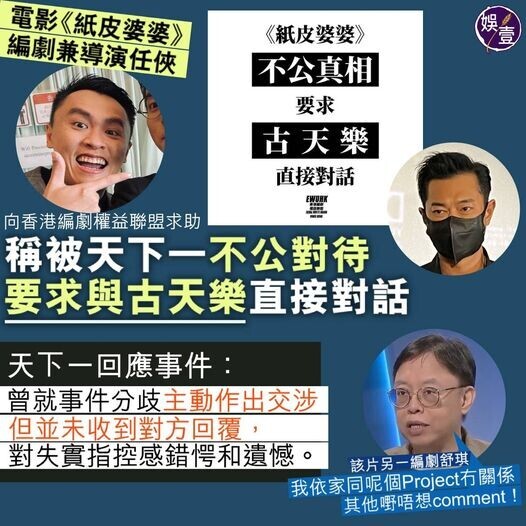 《紙皮婆婆》編劇兼導演任俠 向香港編劇權益聯盟求助 稱被天下一不公對待 要求與古天樂直接對話 天下一:曾就事件分歧主動作出交涉但並未收到對方回覆,對失實指控感錯愕和遺憾。... 今日(23日)傍晚,香港編劇權益聯盟在社交網表示,去年接獲電影項目《 #紙皮婆婆 》的編劇兼導演任俠求助, #任俠 向該會指發現該片的製作公司天下一在處理編劇費、編劇合約,以及「 #金馬創投百萬首獎 」的獎金分配上涉及嚴重不公。 #香港編劇權益聯盟 寫道,任俠作為《紙皮婆婆》的主要編劇,不但被排除於編劇合約之外,編劇費更被拖欠超過三年,最終須由聯盟協助追討。天下一於毫無預警之下,單方面中斷《紙皮婆婆》項目和取消任俠的導演合約,更在從未得到任俠同意下,擅自分配並透支由雙方共同擁有的「百萬首獎」獎金。 聯盟表示,多次就上述事件與負責此項目的天下一高層交涉,惟未能獲得合理的解釋和後續安排。「我們現在嚴正要求與古天樂先生直接對話,以盡快解決《紙皮婆婆》項目開發權和獎金去向等事宜。」 【大綱至劇本第二稿由任俠包辦 未...