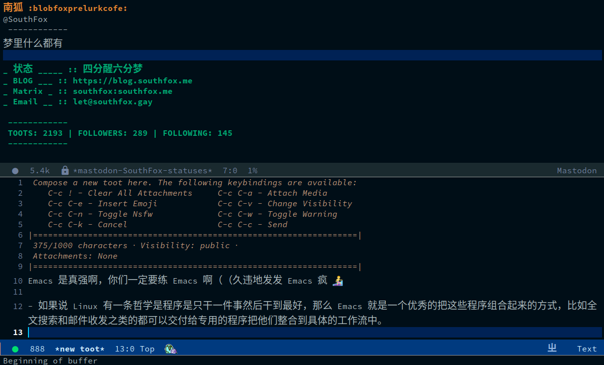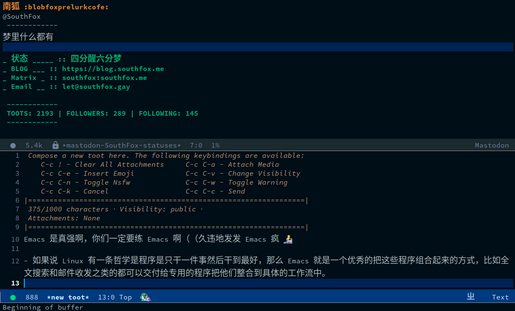 - 地表拓展性最强,这个不多说,因为连本嘟文就是使用 Emacs 包来发送的。 :blobfox_w_: