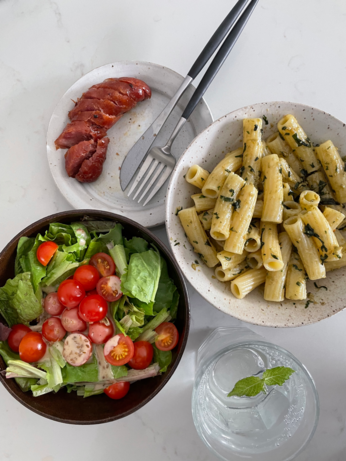 中午本来没心情吃饭,结果莫名其妙搞了一堆。自己种的生菜和番茄配costco的皮鞋沙拉酱还是挺好吃的。大统华台式蒜味香肠用空气炸锅炸一下,加上自己做的pesto。