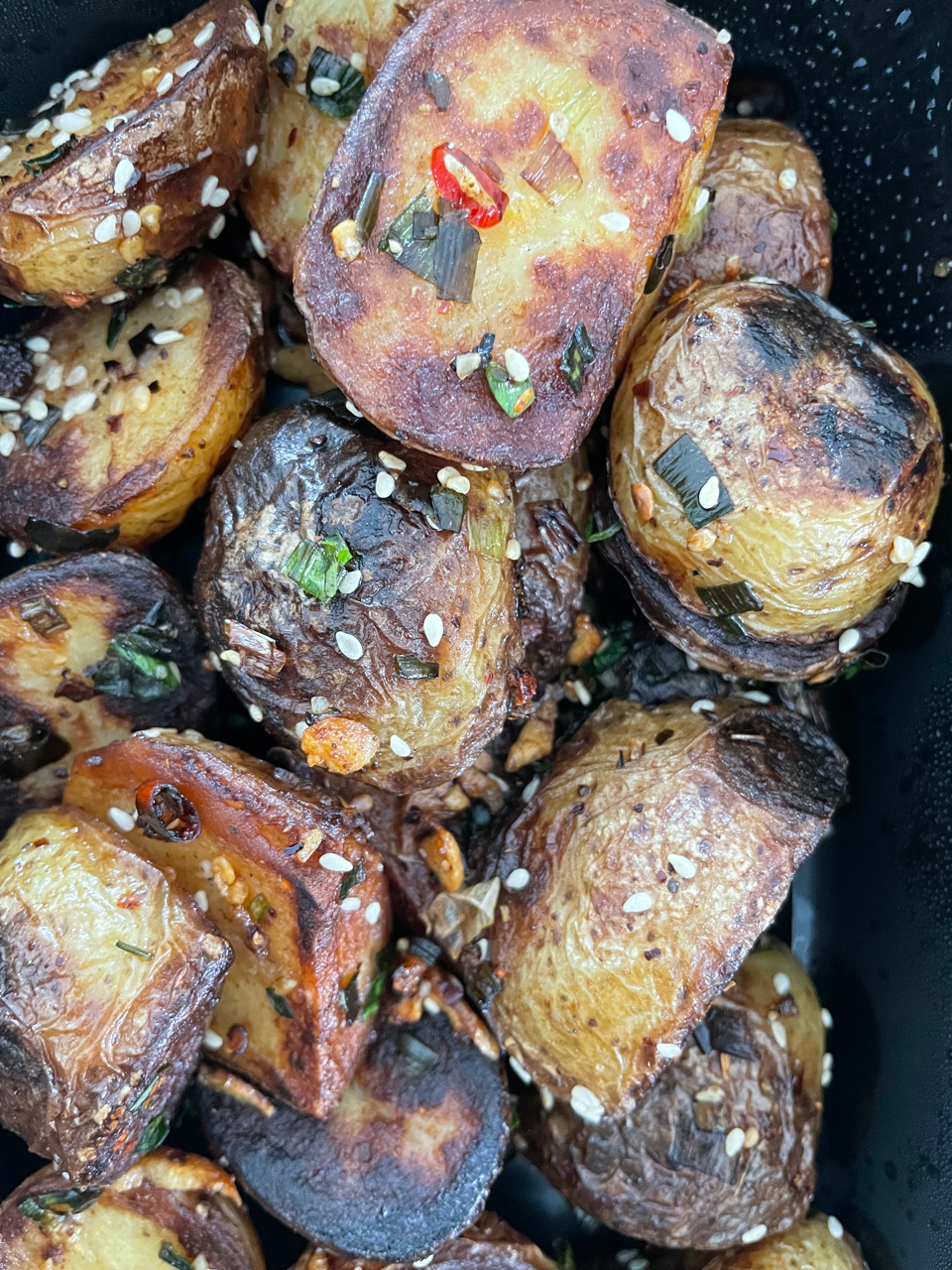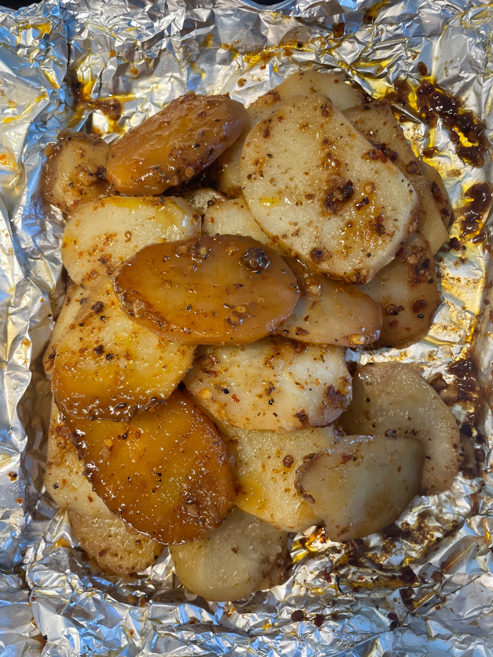 我今天用了单山蘸水,糖,steak seasoning。然后用foil包好扔进烤架,等感觉土豆片软了就可以吃了。适合懒人家庭烧烤露营。看起来不够fancy但是绝对好吃。