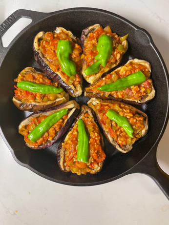 之前在象上看到了这个土耳其Karniyarik菜谱(aka番茄肉末酿茄子),当时看得口水直流。周末在农场买了很多丰收的茄子,辣椒,西红柿,菠菜,还有水果。正好尝试一下这道菜。