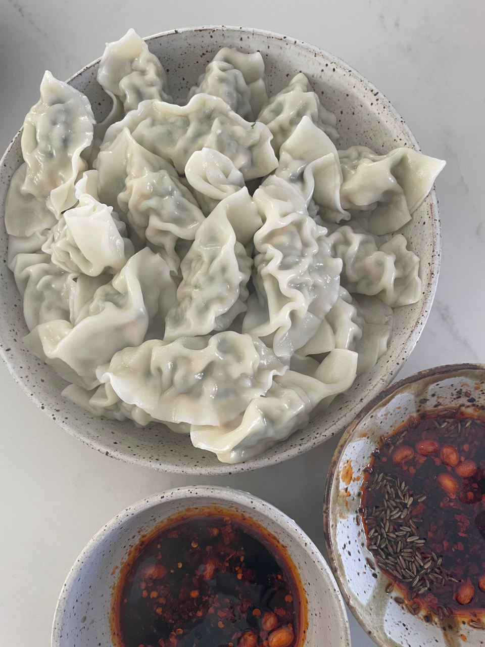 碗底铺上葱花蒜末单山蘸水一撮糖,芝麻可有可无。热油烧到冒烟浇在料碗里,拌匀让所有的调料都被热油激发出香味。趁温度高倒入香醋和酱油。油温不够就不能去掉生葱蒜的味道,而且比较腻。另外橄榄油烟点比较低,需要烧更久,不适合用来做油泼。