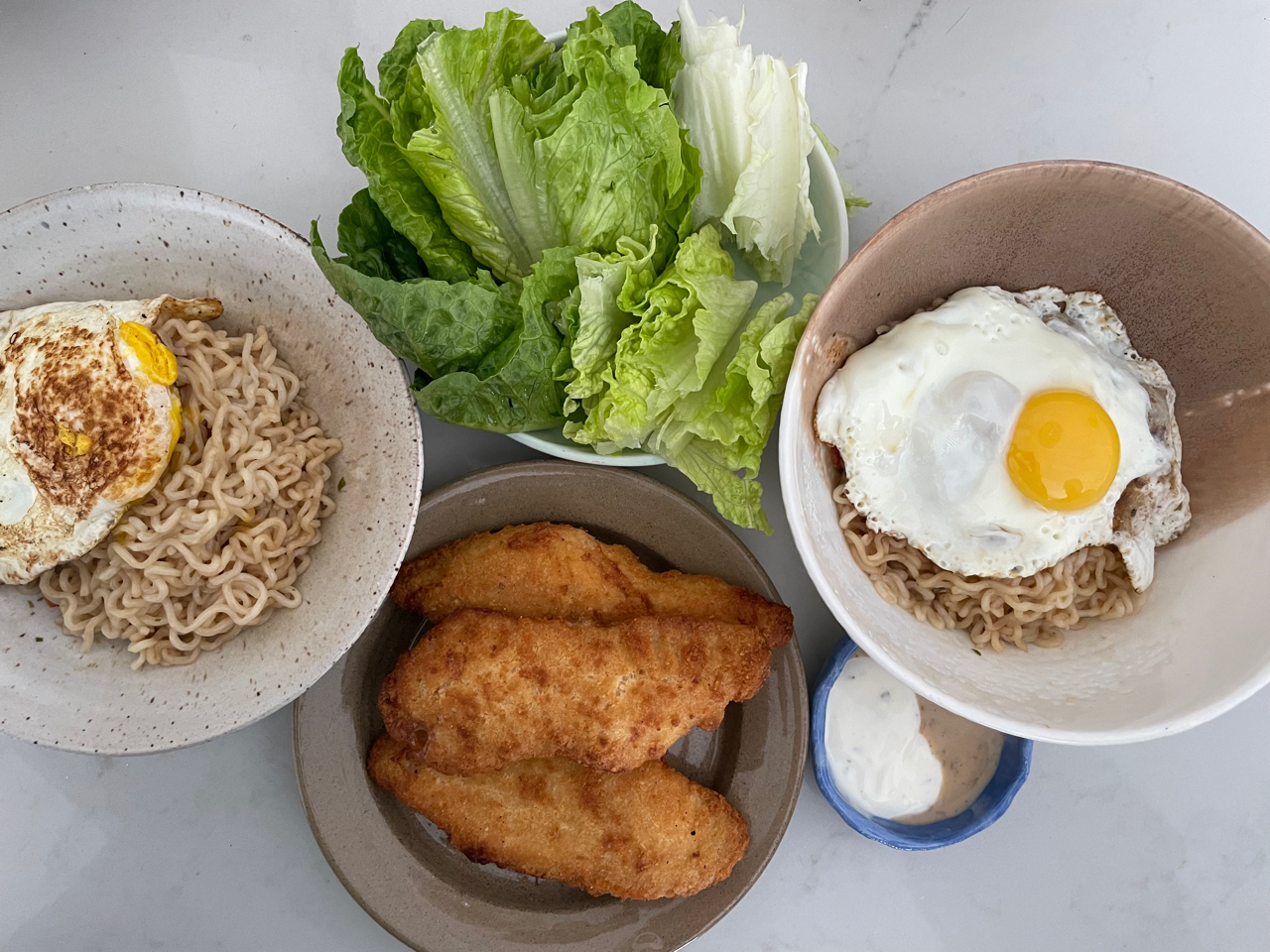 吃了干拌方便面(不如indo那款好吃),煎蛋,空气炸锅炸鱼排,本应该是烫生菜的生生菜:0010:,蘸一点ranch和拖鞋酱(i mean Costco卖的那个deep roasted sesame dressing)。餐具都是来自 老伯and associates