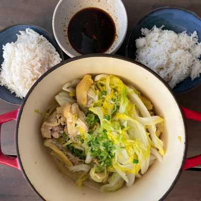 只要前一天买菜的时候买了黄油鸡斩件,家里还有白菜就能做,再调一碗蘸鸡的酱汁就够了。半小时不到就能吃上。有冷冻的猪肚鸡汤料加进去更好,单纯用姜片胡椒盐调味也很好吃。