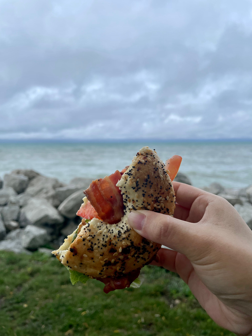 costco everything bagel 在toaster上烤一下,上下涂丘比沙拉酱,放罗曼叶生菜,切片西红柿,撒盐和胡椒,煎好的培根。还可以加一个煎蛋变BELT。白人饭也不是不能吃嘛。