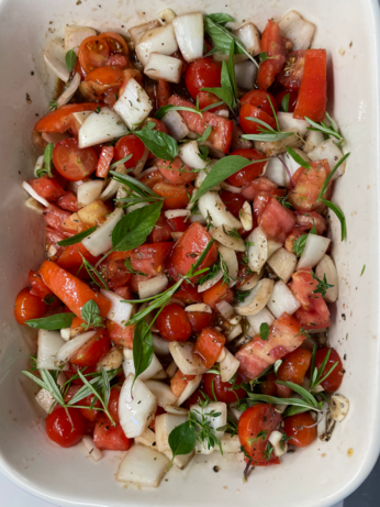 各种番茄切碎,洋葱蒜切碎,加盐胡椒橄榄油balsamic vinegar干香草碎鲜香草拌匀,放烤箱里350F 烤30min左右,至香味四溢番茄软烂。