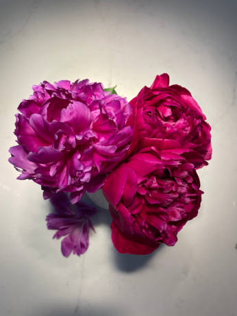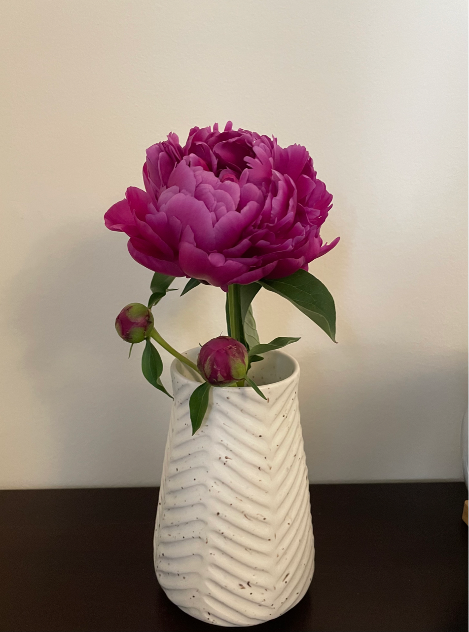 我的眼睛果然没问题。同一株芍药真的长出来两种颜色。图一偏紫的是上周剪下来的,偏玫红的是刚刚剪下来的。我想是不是是紫外线给花上色了?