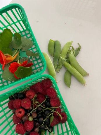 收获第一波农产品。旱金莲(叶子和花可以食用),覆盆子和黑加仑,还有一些豌豆。