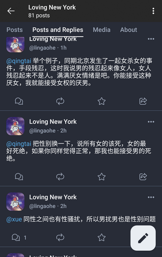 摘录此人简介:“專業激怒政治正確婊,專業激怒打著女權旗號卻搞性別壓迫性別歧視的假女權,爭取被政治正確婊和假女權拉黑。遇到無賴和杠精就拉黑,有時候先臭罵一頓再拉黑。沒有臭罵的那些,一部分是過於低賤不值得浪費生命去罵,另一部分是為了慣著,讓它養成愚昧的慣性。”