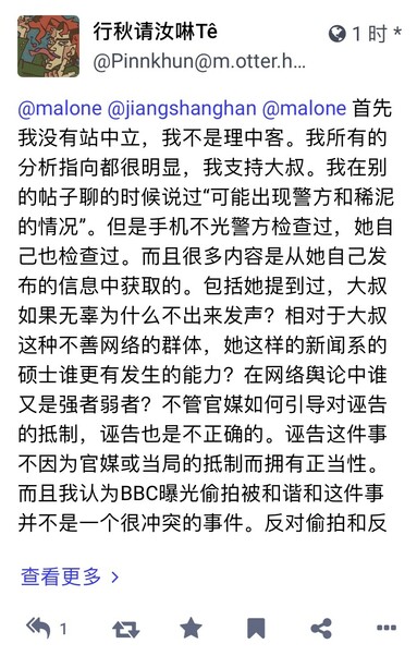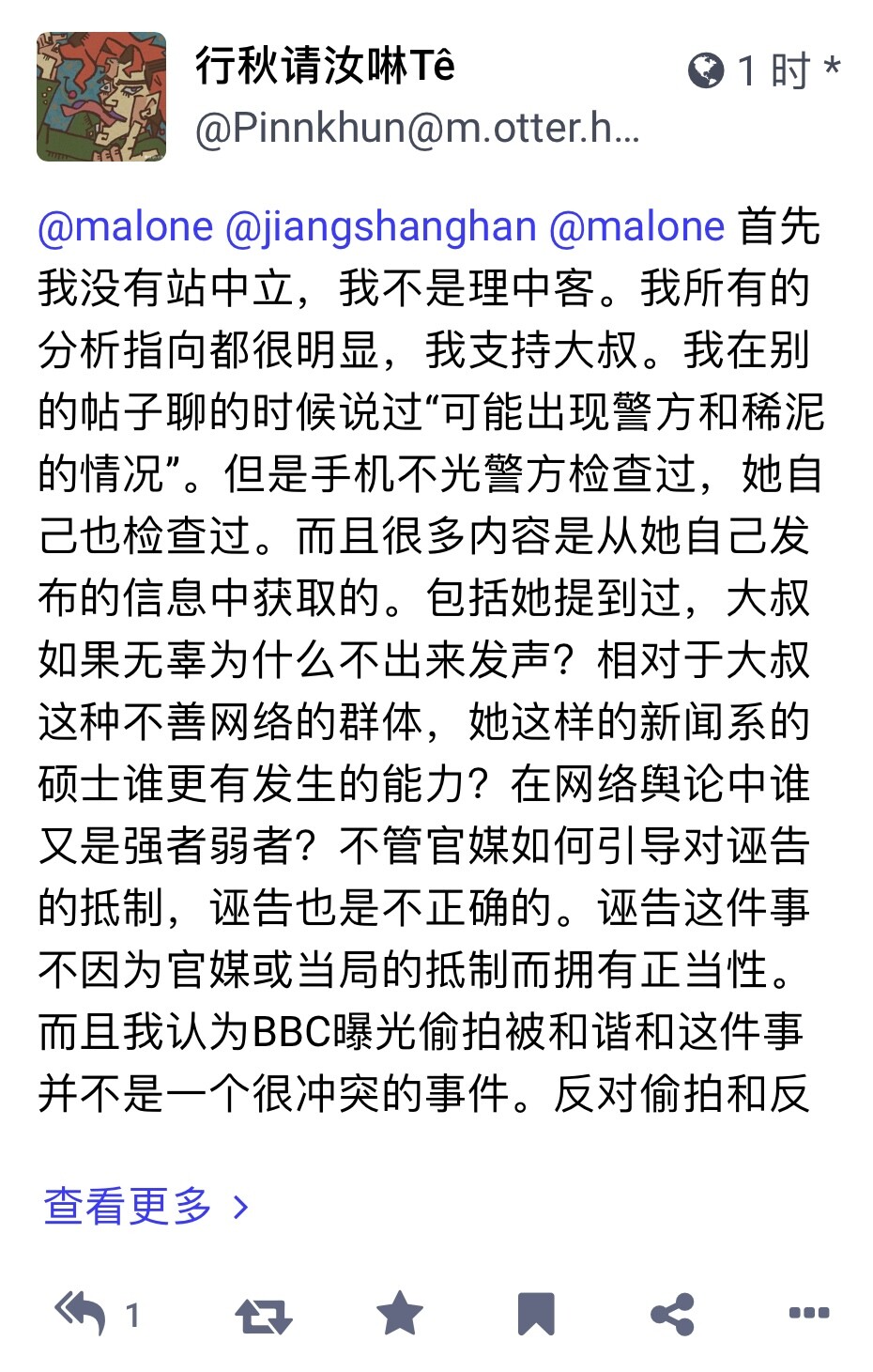 ID如图,另附一张在“以为茅海建被抓有些可惜”的嘟文下此人的评论。按需拉黑。PS:反正你不拉黑也是被骂作女权婊啦,还要着一假字。什么小学鸡咬架。确实是天下苦猪头久矣(叹气)。