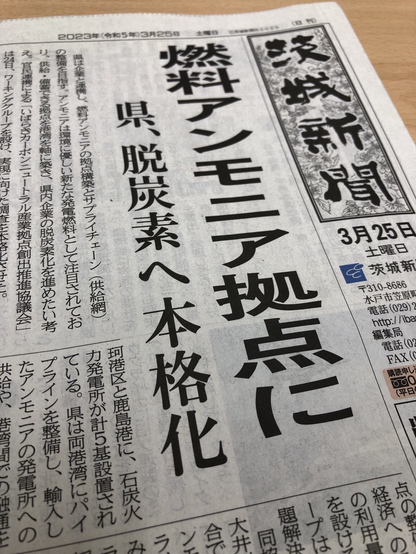 茨城新聞、本日2023年3月25日の一面見出し。いばらきカーボンニュートラル産業拠点創出推進協議会は燃料アンモニア拠点を中心に進めていく様子。
